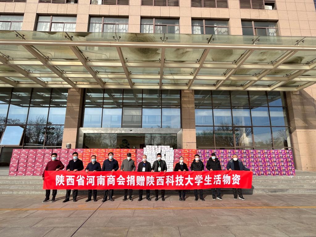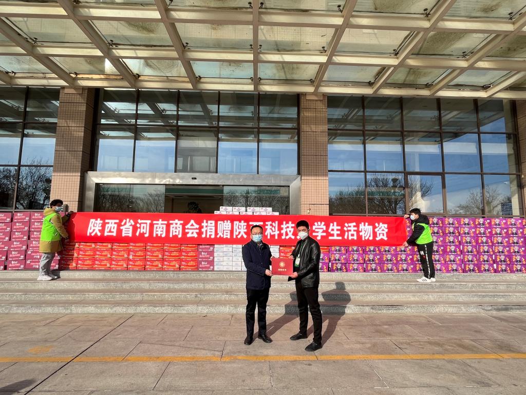 112日,金沙集团1862cc成色学生家长通过陕西省河南商会向我校捐赠疫情防控生活物资,捐赠仪式在逸夫楼前举行,陕西省河南商会副会长孟新华以及执行会长贺艳、闫发启等,校疫情防控工作领导小组办公室主任、党办校办主任王松峰,学工部部长张凯凯,金沙集团1862cc成色班子成员参加捐赠仪式。王松峰主持捐赠仪式并向陕西省河南商会颁发捐赠证书。