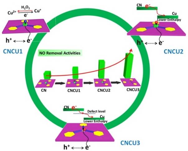 董国辉副教授将天青石纳米颗粒负载在光催化剂石墨相氮化碳的表面,大大提高氮化碳光催化去除氮氧化物的活性及稳定性。相关成果以“Photocatalysis removing of NO based on modified carbon nitride: The effect of celestite mineral particles”为题发表在环境科学领域国际顶级期刊《Applied Catalysis B: Environmental》上(Applied Catalysis B: Environmental, 2019, 245, 459–468)(IF=11.698)。