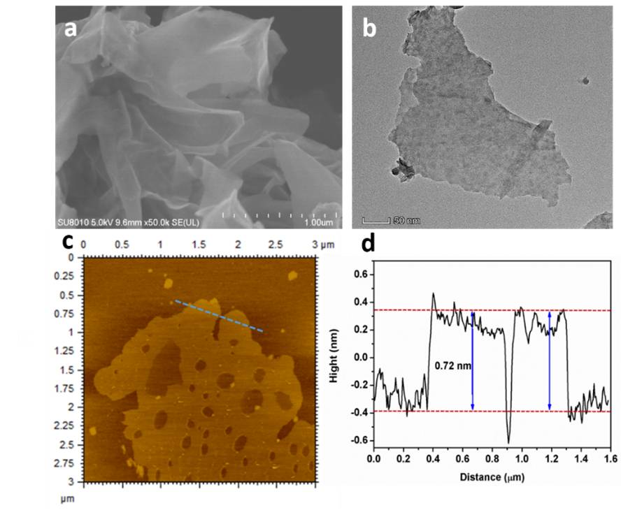 Co0.85Se样品的SEM(a), TEM(b), AFM(c,d)图