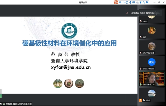 范老师的讲座题目是“硼基极性材料在环境催化中的应用”,详细介绍了硼基材料在光催化、压电催化及光-压电协同催化领域的新应用,提出了硼基极性材料中存在的极化电场为自由载流子的分离和迁移提供了强大的动力,因此相对传统材料表现出了更为优异的催化性能,展示出该材料在未来的催化领域具有重要的研究意义。