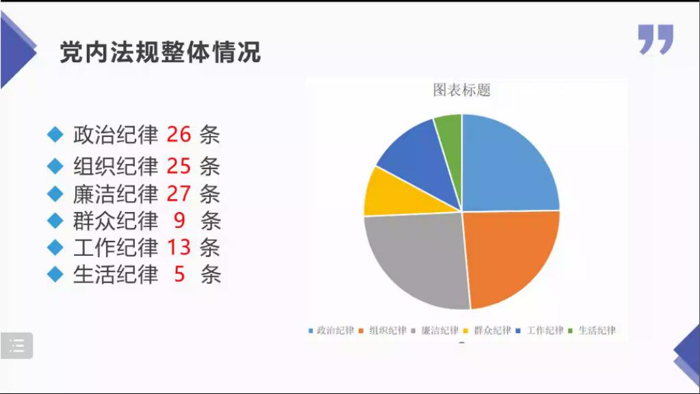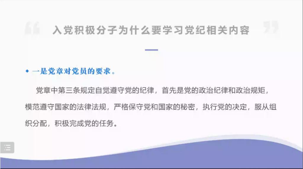 首先靳凯老师为我们讲述了入党积极分子为什么要学习党纪相关内容:一是党章对党员的要求二是单位群体组织架构的内在要求三是党的性质决定的四是党的历史发展经验的总结