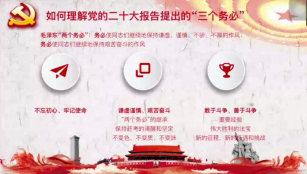 支部书记李丹清同志首先详细介绍了党的二十大的主题:高举中国特色社会主义伟大旗帜,全面贯彻习近平新时代中国特色社会主义思想,弘扬伟大建党精神,自信自强、守正创新,踔厉奋发、勇毅前行,为全面建设社会主义现代化国家、全面推进中华民族伟大复兴而团结奋斗。其次,着重强调了二十大报告中的一些数字:3个务必、3件大事、5个“必由之路”和5个重大原则,特别是3个务必:必不忘初心、牢记使命;务必谦虚谨慎、艰苦奋斗;务必敢于斗争,善于斗争。