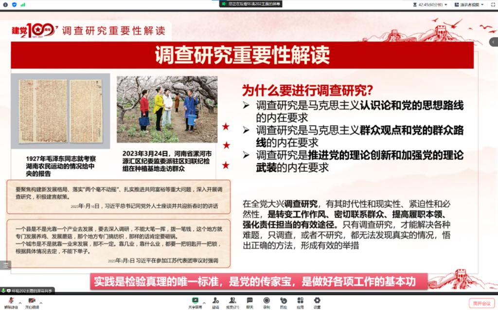 8月16日15:00,金沙集团1862cc成色本科第二党支部在腾讯会议上开展了“跟总书记学调研”交流研讨会活动,由支部副书记王孜昊主持会议。