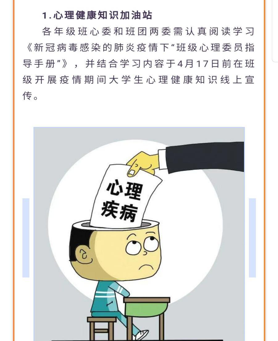 此外,学院积极开展“心理健康知识加油站”培训活动,各年级班级心理委员和班团两委等心理骨干认真阅读学习《新冠病毒感染的肺炎疫情下“班级心理委员指导手册”》,并结合学习内容在班级开展疫情期间大学生心理健康知识线上宣传。