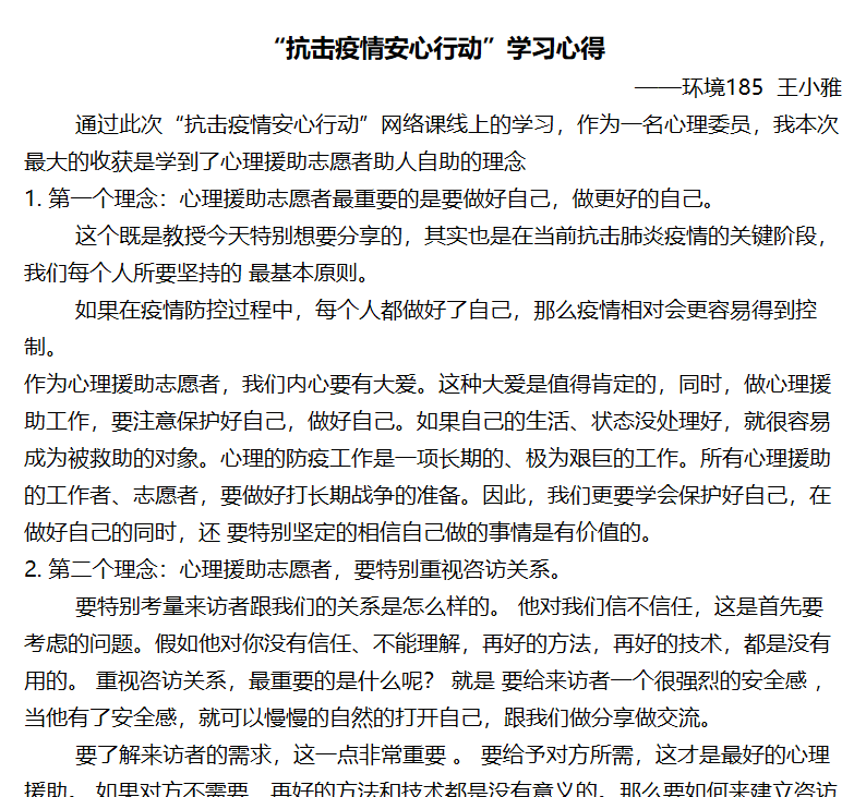 2月18日学院组织全体班级心理委员参加由中国心理学会与中科院心理所联合开展的“抗击疫情安心行动”系列公益讲座网络课程培训,并撰写学习心得,积极向班级宣传分享学习内容。疫情期间,学院结合学生特点和需求,积极开展线上心理健康知识宣传,利用学院微信公众号“环视角”推送心理健康知识,定期宣传我校疫情期间面向师生的网络心理辅导平台及咨询方式。
