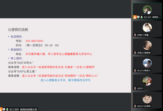 培训后,参会的班级心理委员纷纷分享了心得收获,表示通过这次线上交流,了解到了心理咨询预约的流程,有电话预约、现场预约、网上预约(公众号“SUST云科大”“SUST心灵之海”)。作为班级心理委员,要善于观察班级成员的言行举止,能够在自己能力范围内对同学做好心理倾听和疏导,善于倾听、稳定他人的情绪,做好保密。要克服自己不良情绪的干扰,在不断提高知识素养的基础上,培养自信乐观、豁达开朗的健康心理,这次的交流分享让自己受益匪浅。
