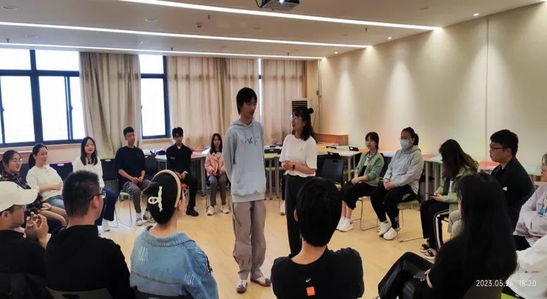 首先,以“大风吹小风吹”的热身游戏,结合抢凳子,通过表达相似或者特殊的特征,拉进大家的距离。让没抢到的凳子的同学表演才艺或者介绍自己,让大家相互认识。现场氛围十分融洽热闹。